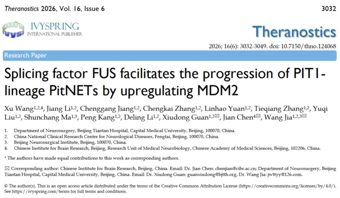 近日,北京脑科学与类脑研究所陈坚团队与首都医科大学天坛医院贾旺团队的研究人员合作在 Theranostics 上发表文章 "Splicing factor FUS facilitates the progression of PIT1-lineage PitNETs by upregulating MDM2"。研究阐明了FUS蛋白作为PitNET剪接因子的关键功能,使用反义寡核苷酸ASO靶向其介导的MDM2相关的剪接机制可以恢复抑癌蛋白p53表达水平,从而抑制肿瘤的进展。这一发现为PIT1谱系PitNET的临床治疗提供了一种潜在的新颖策略。
