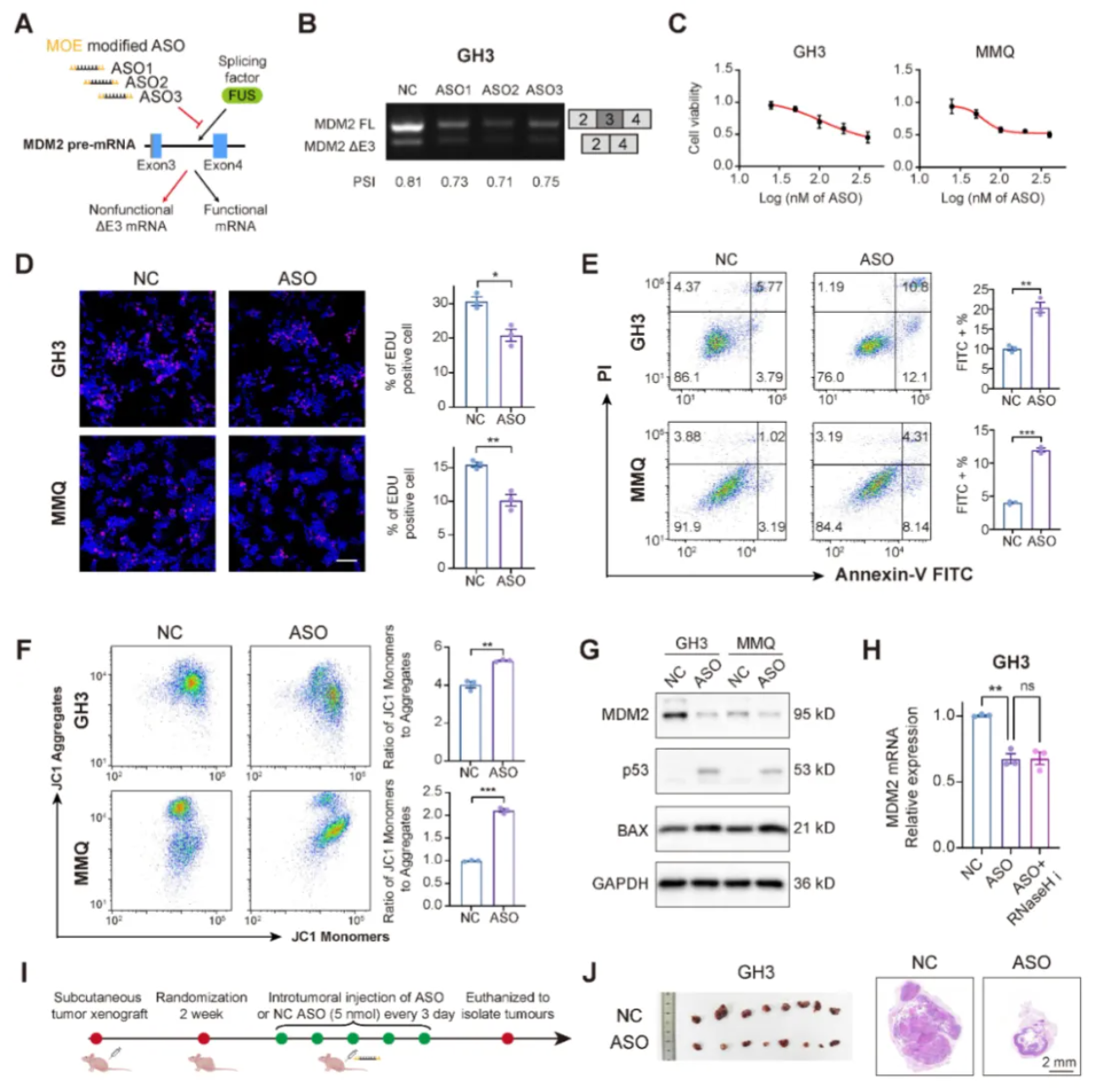 p53蛋白是MDM2的下游经典抑癌蛋白,在垂体瘤中突变率较低,能否抑制MDM2的异常剪接以恢复肿瘤中p53活性,是课题的下一个目标。ASO能够与前体mRNA结合,促进剪接转换或RNA降解,这些机制已被作为与剪接异常相关的各种疾病的治疗策略。为了评估ASO在PitNET中的治疗潜力,设计了针对MDM2前体mRNA的ASO,并结合2'-O-甲氧基乙基(MOE)修饰以增加其稳定性。ASO成功诱导MDM2外显子3的剪接跳跃,以100 nM浓度处理持续48小时可有效抑制PitNET细胞的增殖,促进凋亡并减弱线粒体活性。ASO处理降低了MDM2蛋白水平,进而降低了p53表达并提高了其促凋亡下游蛋白BAX的表达。在皮下异种移植模型中,通过瘤内注射施脂质体包被的ASO,显著减少了肿瘤体积。