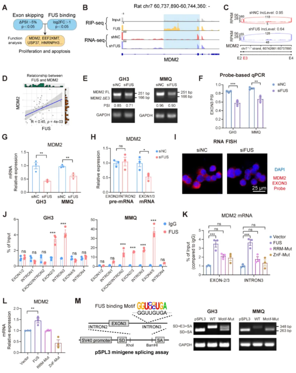 通过对课题组前期建立的垂体瘤样本库和正常垂体样本进行测序,对剪接因子蛋白进行蛋白表达和功能筛选,聚焦到FUS剪接因子的异常功能。敲减FUS蛋白后发现RNA-seq鉴定的差异表达基因与p53通路相关,例如细胞凋亡、DNA修复和细胞周期调节,以及垂体激素分泌相关通路。为了探究FUS作用机制,进行了针对FUS蛋白的RIP-seq,从可变剪接分析结果和FUS结合底物的交集中分析所有候选基因。IGV可视化显示候选基因MDM2外显子和内含子区域内都有FUS蛋白结合,同时FUS的敲低促进了MDM2基因中外显子3的跳跃。设计RIP-qPCR中前体mRNA的不同区域的PCR引物,均检测到FUS与前体mRNA结合。先前研究表明ZnF和RRM结构域介导FUS蛋白的剪接调节。为了分析剪接活性是否依赖于直接的FUS-RNA相互作用,我们创建了具有RRM突变或ZnF的功能域突变体。RRM和ZnF结构域内的点突变阻碍了FUS与MDM2前mRNA的结合,同时消除了其对MDM2表达的影响。随后进行pSPL3 mini基因剪接验证,将MDM2的外显子3和侧翼内含子克隆并插入到pSPL3 mini基因中,在组成型剪接供体(SD)和剪接受体(SA)位点之间具有FUS结合位点的野生型(WT)或突变体(Motif-Mut)序列。FUS结合序列的突变破坏了MDM2外显子3的剪接。综上确定MDM2是FUS的剪接底物,并证明FUS通过外显子3的剪接过程来促进MDM2蛋白的表达。