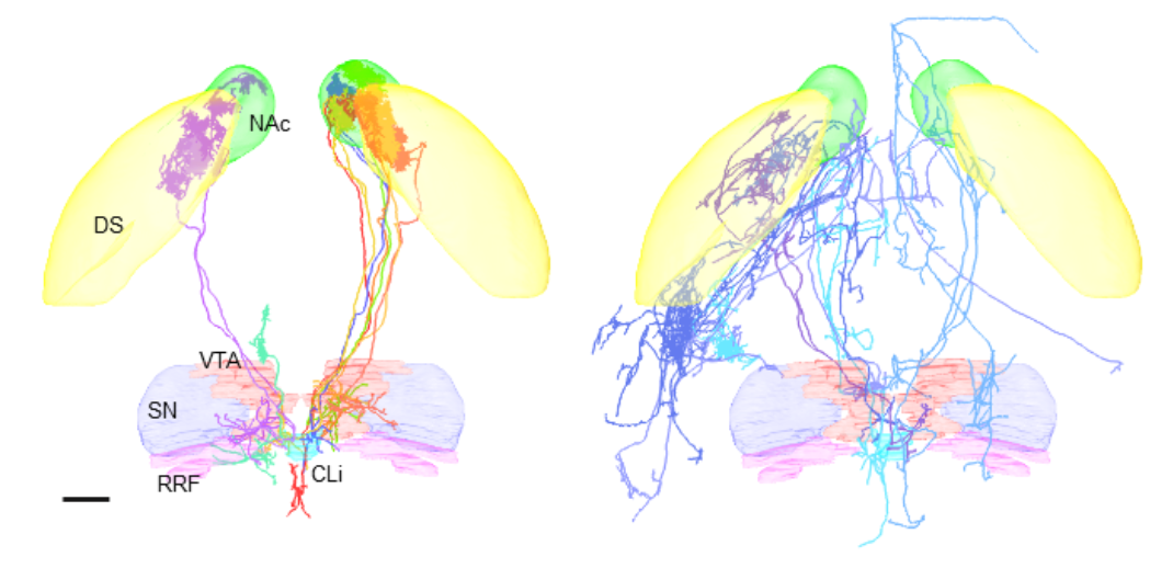 基于这一标记系统,罗敏敏课题组与华中科技大学国家光电研究中心fMOST课题组合作,建立了“稀疏标记-样本包埋-fMOST成像-神经元重构-数据校准-量化分析”的流水线,实现了稳定高通量的全脑成像和图像分析。借助这一流水线,研究人员在DAT-Cre小鼠中重构了15个中脑多巴胺神经元的完整形态。通过单细胞形态学分析,研究人员能够将重构的多巴胺神经元分为两类:一类多巴胺神经元只有单个投射目标,轴突在终点处会形成密集的末端树状分支(图二左);另一类投射轴突分布比较广泛,会有多个旁分支投向不同目标,少有末端树状分支(图二右)。