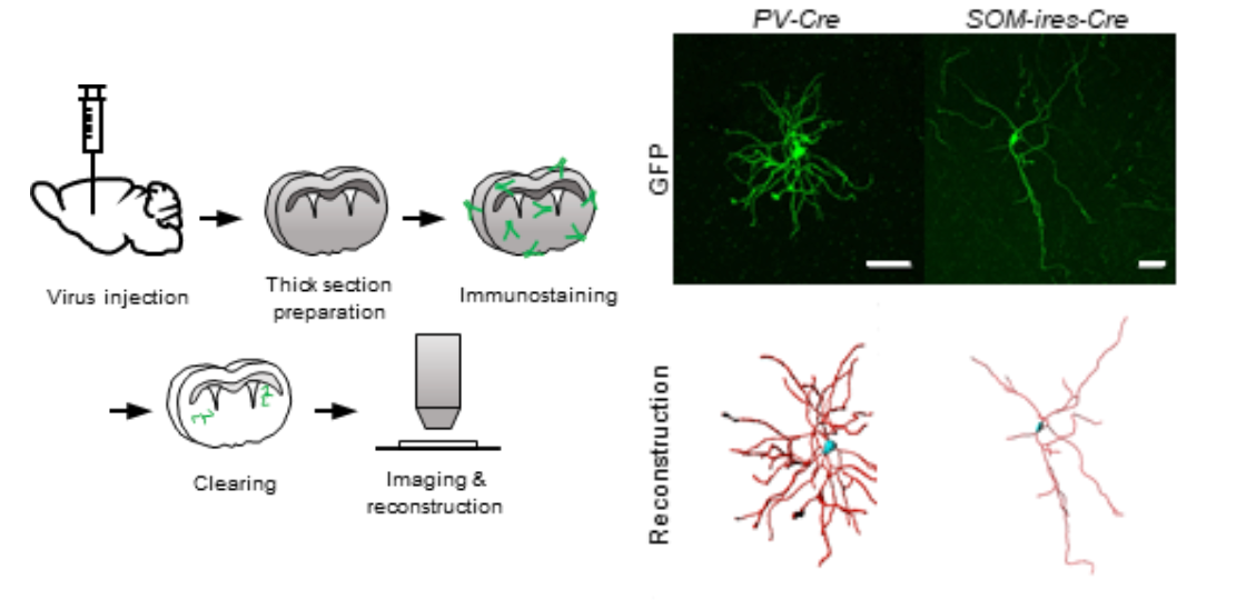 组织透明化是近期成像领域屡有突破的技术。研究人员将稀疏标记系统与组织透明结合,在PV-Cre和SOM-ires-Cre小鼠中特异性的标记了两类中间神经元,制成脑片后用uDISCO方法进行透明化处理。随后在共聚焦显微镜下成像,并对对神经元进行了重构。通过此方法,研究人员实现了中间神经元的快速重构,并且可以高效地对神经元树突的分支特征进行量化分析(图四)。