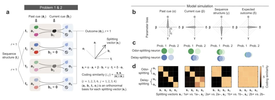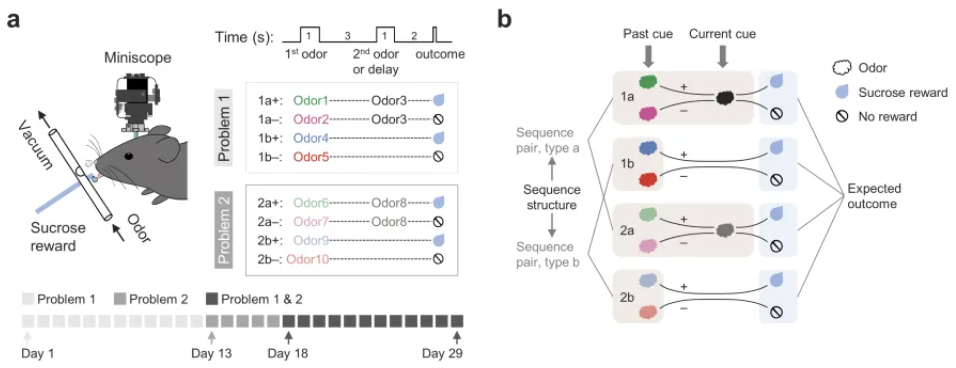 具体来说,该研究训练头部固定小鼠学习四个“嗅觉线索-结果”序列对。每个序列对中的两个序列包含一段共同的经历:相同的气味刺激或者相同的延迟时期——这两种经历定义了两种序列结构(a和b):