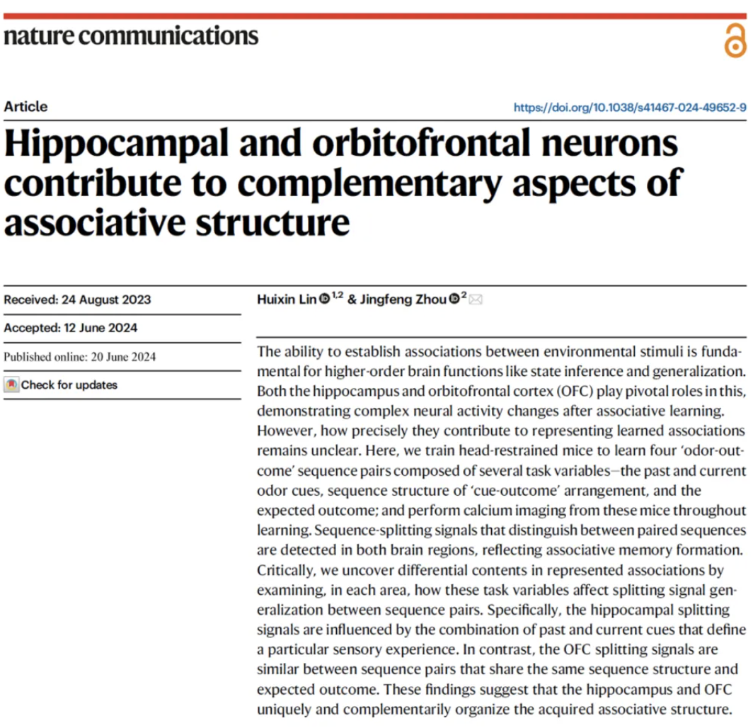 Nat Commun | 北京脑所周景峰实验室:海马和眶额叶皮层在编码关联结构中的互补作用