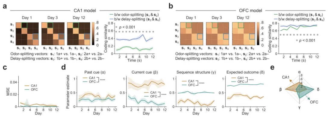 在整个学习过程中,该研究使用单细胞钙成像技术记录了小鼠海马和眶额叶皮层的神经元活动。在相同经历时期出现的具有序列选择性的神经元被称为“序列区分神经元”。这类神经元的比例在两个脑区中均随着学习逐渐增加,表明关联结构的形成。在神经元群体水平上,序列区分信号可以被定量为四种任务变量的线性整合,而这四种任务变量对应的权重系数反映了每个任务变量对序列区分信号的贡献,即该变量信息在两个脑区的编码程度。通过模型模拟发现,在不同权重系数下,四个序列区分信号的编码相似模式截然不同。