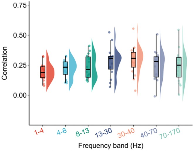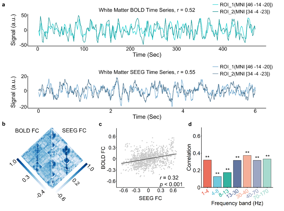 图1:对单个被试分析,发现BOLD和SEEG白质功能连接的相关在多个频段稳定存在。