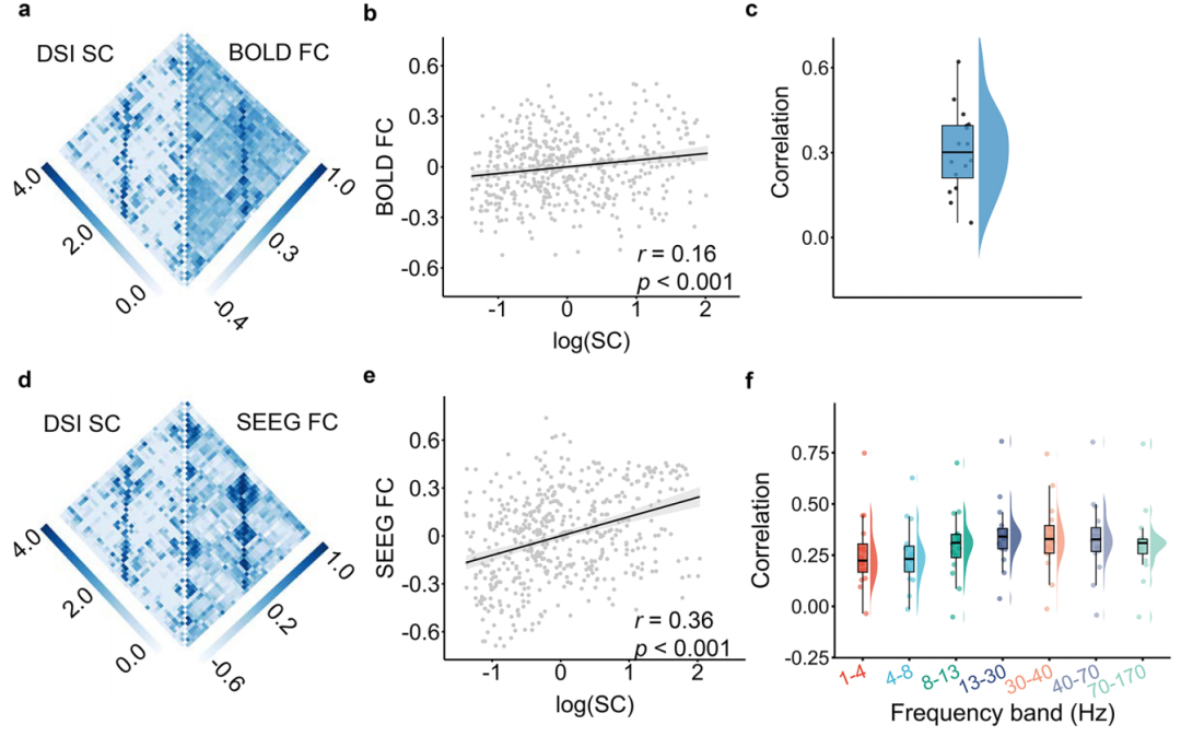 结果表明,每位被试的白质BOLD功能连接与白质SEEG功能连接在多种频带范围内高度相关,表明白质BOLD功能连接具有底层的神经电生理基础。图1中a呈现了两例白质脑区BOLD功能连接与颅内SEEG功能连接(功能连接即两个脑区时间序列的相关性),b呈现了一例被试的BOLD功能连接与1-4 Hz频段下的SEEG功能连接矩阵,c图表明这两个矩阵具有显著相关,d图表明BOLD功能连接与不同频段下的SEEG功能连接都具有显著相关。我们发现所有16个被试上白质BOLD功能连接与不同频段下SEEG功能连接相关,其中绝大部分相关性经过多重比较矫正后仍保持显著(图2)。进一步分析表明白质的BOLD和SEEG功能连接均与其结构连接相关,印证了功能连接受结构连接约束(图3)。这些结果在不同被试间表现出稳定的可重复性。
