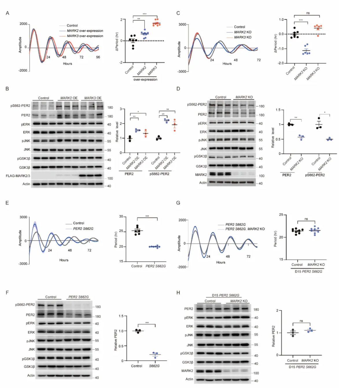 MARK2与PER2特异性结合,并通过磷酸化S662位点延缓PER2蛋白的降解。在野生细胞中敲除MARK2导致细胞节律周期缩短,而在引入S662G突变的细胞中再次敲除MARK2,则不再影响细胞节律,表明其调控作用完全依赖于S662位点。