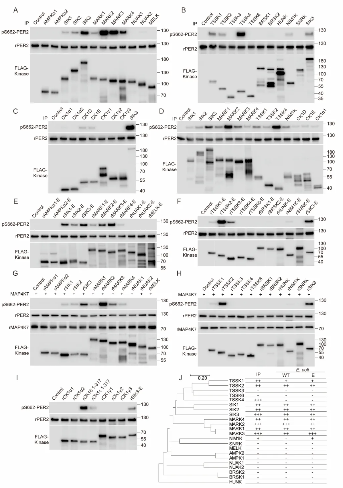 研究团队利用磷酸化S662特异性抗体,从50L HEK293细胞裂解液中,通过生物化学纯化技术鉴定出MARK2(属于AMPK相关激酶家族成员)是PER2 S662的新激酶。在细胞中过表达MARK2会增强S662磷酸化水平,而敲除MARK2则降低之;体外实验证实,细菌表达的MARK2的活化突变体直接磷酸化PER2的S662位点。