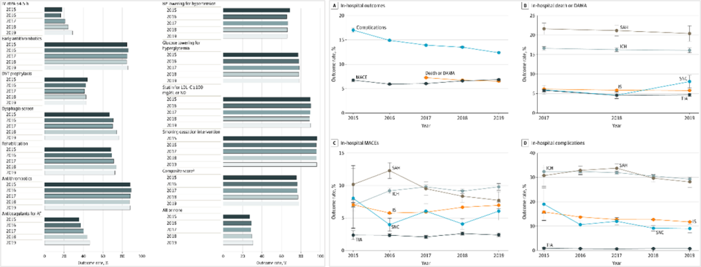 从2015年8月CSCA项目开始,到2019年7月这四年间,院内医疗服务指标,特别是tpA静脉溶栓、吞咽功能筛查以及合并房颤病人的口服抗凝药物等指标改善明显。院内死亡或非医嘱离院、院内并发症等结局也有明显的改善。