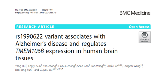 2021年1月19日,首都医科大学北京脑重大疾病研究院刘桂友教授团队在BMC Medicine杂志发表了题为 “rs1990622 variant associates with Alzheimer’s disease and regulates TMEM106B expression in human brain tissues” 的研究论文,阐明了rs1990622变异通过调控TMEM106B基因表达增加阿尔茨海默病(Alzheimer’s disease,AD)风险的潜在作用机制。