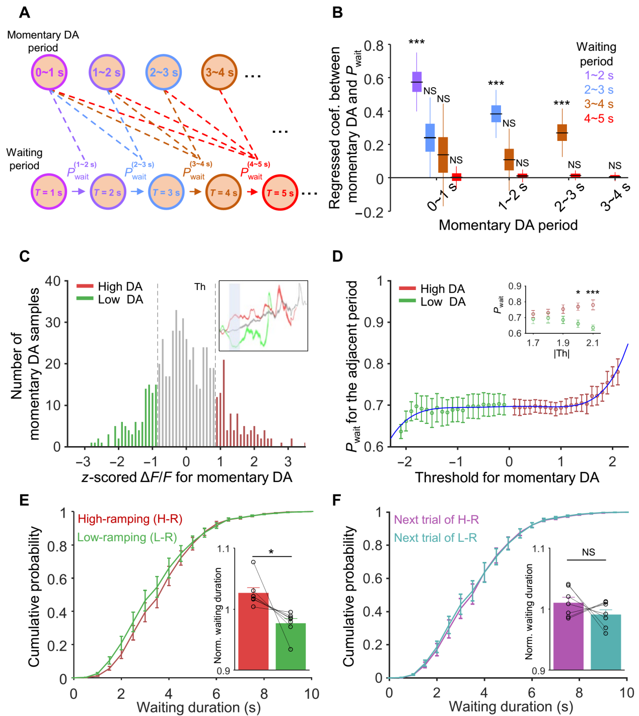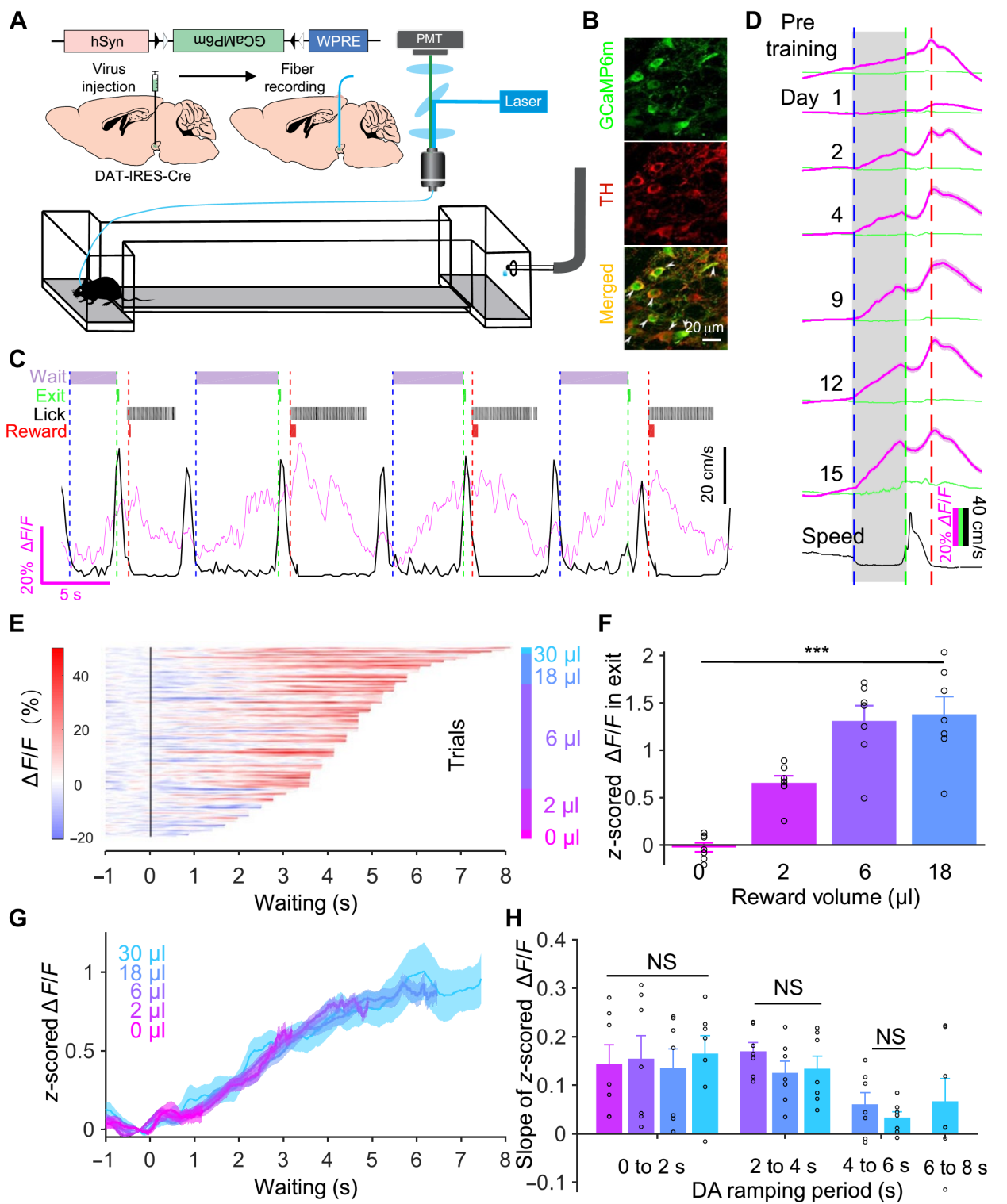 图1:光纤记录与VTA多巴胺能神经元在小鼠等待期间的钙活动变化