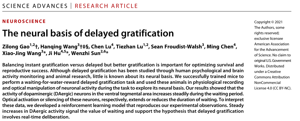 2021年12月1日,北京脑科学与类脑研究中心孙文智团队,上海科技大学胡霁团队和纽约大学汪小京团队在国际期刊Science Advances在线发表题为“The neural basis of delayed gratification“的研究论文,揭示了VTA多巴胺能神经元在延迟满足这一心理过程中的神经基础,为提高自控能力和治疗注意力缺陷多动障碍提供了一定的思路。