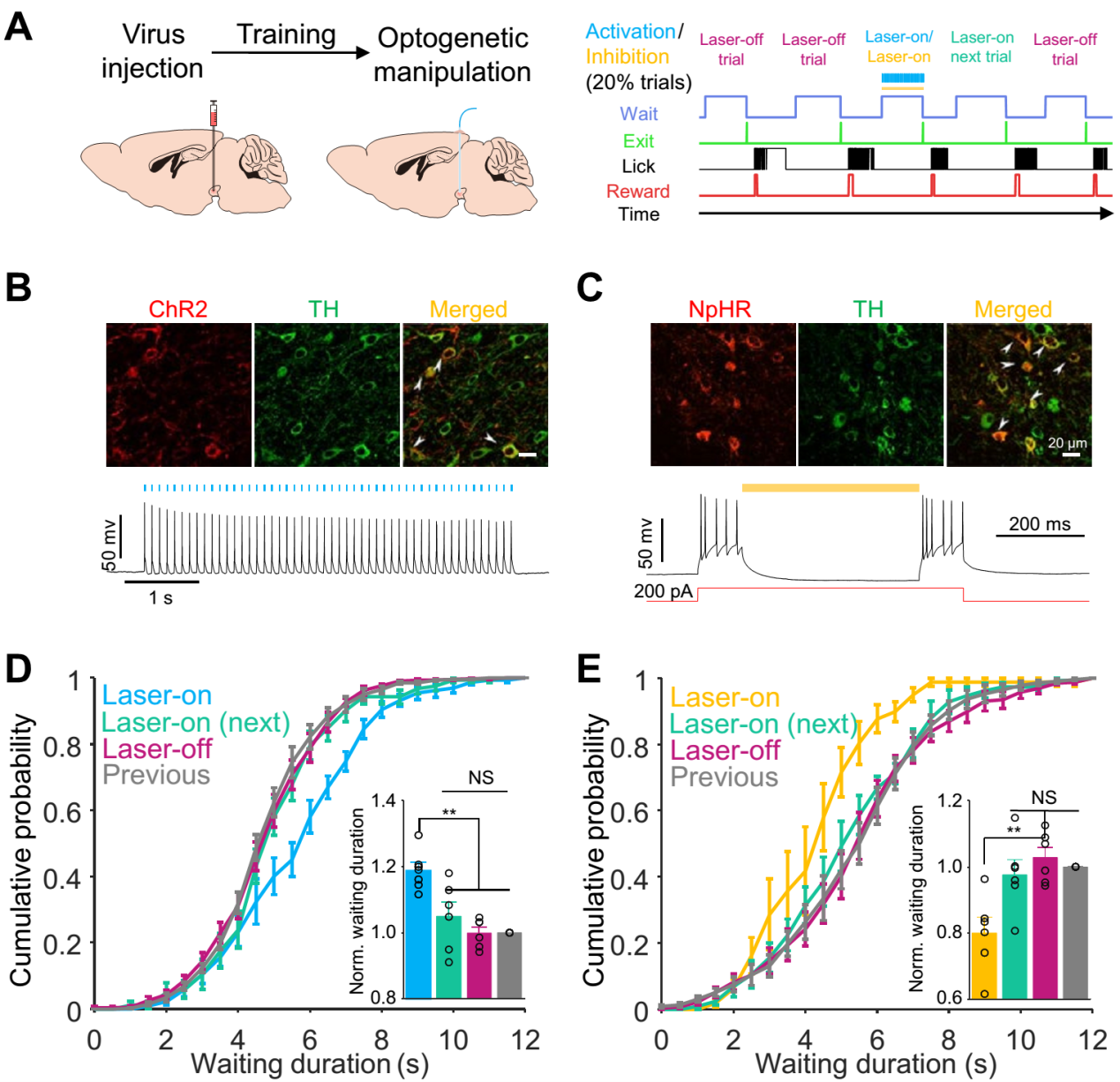图2:光遗传操控显著改变了小鼠的等待行为