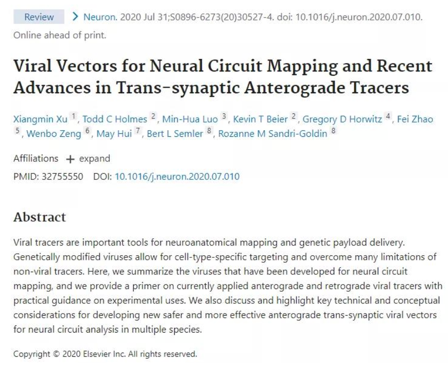 根据是否能够跨神经元传播,病毒工具可被分为两类:不传播的基因转移工具,和跨神经元传播的环路示踪工具。前者的代表是腺相关病毒(AAV),往往用于在神经系统中表达特定目标基因,或者荧光蛋白、生物探针、光遗传学元件等,也可以用于表达shRNA进行特定基因的敲降,或sgRNA结合Cas9进行CRISPR基因编辑。而跨神经元传播的环路示踪工具又可根据其传播的方向分为逆向(retrograde)和顺向(anterograde)示踪工具。逆向示踪工具以狂犬病毒(RV)和伪狂犬病毒(PRV)Bartha株为代表,在它进入神经元后,可独立或依赖辅助病毒进行复制,新生成的子代病毒工具从突触后传播到突触前,进而感染上一级神经元,在此过程中病毒示踪工具利用自身表达的荧光蛋白标记所感染的神经元,从而描绘神经元输入网络。顺向示踪工具发展较慢,除了高滴度的AAV1或AAV9外,目前的发展重点主要集中在1型单纯疱疹病毒(HSV-1)H129株上。加州大学欧文分校的徐祥敏教授近日在Neuron杂志上发表综述(Neuron. 2020; S0896-6273(20)30527-4.),详细介绍了上述神经科学中所用的病毒工具。赵非以共同作者身份参与了该综述的撰写。