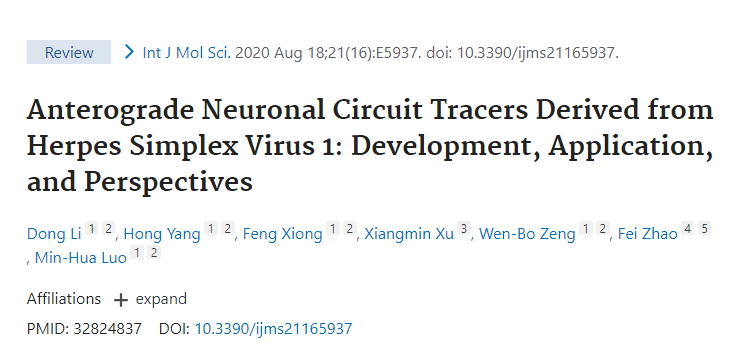 近期,北京脑科学与类脑研究中心(CIBR)载体工程中心主任赵非实验室与中国科学院武汉病毒研究所罗敏华研究员课题组联合在International Journal of Molecular Sciences发表综述,总结介绍了用于解析神经环路输出神经网络的疱疹病毒HSV1-H129(以下简称H129)示踪工具的发展过程及应用现状,并从载体工程的角度提出了该工具的潜在优化和发展预期;同时,双方还共同在Neuroscience Bulletin发表文章,详细介绍了其团队前期发展的H129疱疹病毒顺向示踪工具的生产和使用的操作方法,以帮助广大神经科学家更好的应用该系列工具。