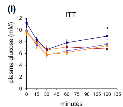 本次工作中同时发现,ALK7的敲除能够使肥胖小鼠回归高脂饮食后仍然葆有抗肥胖的效应。将前期实验中的部分肥胖小鼠换回高脂饮食后观察5周发现,换回高脂饮食后野生型小鼠的体重甚至回升到高于先前保持高脂饮食时的体重巅峰;而更换两次饮食的突变体小鼠体重回升明显较慢,且最后达到的体重也与一直保持高脂饮食的突变体有明显差异。此外,两次改变食谱的小鼠与一直高脂饮食的小鼠相比葡萄糖耐受性降低,胰岛素敏感性升高。其他相关指标的检测也同样说明,ALK7敲除的小鼠在换回高脂饮食的条件下仍能保持抗肥胖的能力。