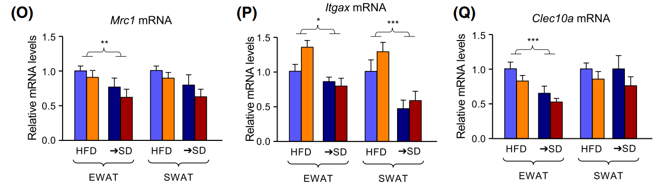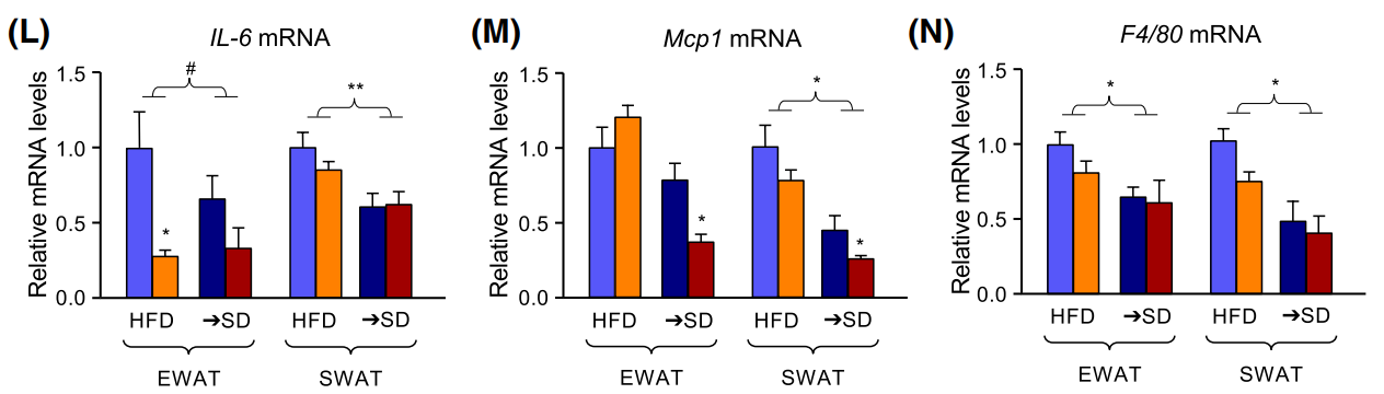 对脂肪组织炎症以及分化指标的监测显示,cAMP和HSL的浓度在突变体食谱转换后上升,同时儿茶酚胺受体Adrb1、Adrb3的mRNA及瘦素mRNA的浓度发生变化。以上均证实ALK7的失活与饮食转换共同对营养过剩后恢复儿茶酚胺受体的敏感性发挥了作用。对炎症的标记蛋白IL-6、Mcep1及F4/80、Mrc1、Itgax、Clec10a的浓度检测结果同时表明,饮食变化后脂肪组织的炎症明显减少。