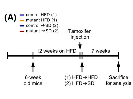 本次工作中发现,ALK7受体基因的敲除增强了肥胖小鼠低热量饮食的效果。小鼠在12周高脂饮食后被注射Tamoxifen,随后突变型和一部分野生型小鼠继续高脂饮食,另一部分野生型换成低热量饮食持续5周。实验发现ALK7敲除的小鼠在高脂饮食下体重增长速度比野生型要慢;在更换饮食后体重变化趋势与野生型相似,但是体重明显下降更多。