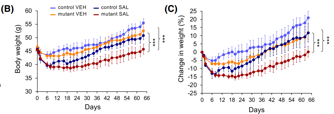 本次工作过程中另外发现,ALK7基因的敲除与水杨酸盐共同作用,减轻由饮食习惯引起的肥胖。脂肪组织中儿茶酚胺的敏感性以及脂肪组织的炎症情况都是衡量肥胖的重要标准。Carlos团队在向小鼠注射Tamoxifen的同时,注射具有抗脂肪组织炎症作用的水杨酸盐,发现全部小鼠的体重在注射后均有下降,但是突变体小鼠能够长久地维持减肥效果,保持体重仍低于初始值。同时,突变体小鼠的脂肪细胞大小也与野生型小鼠有较大差异。