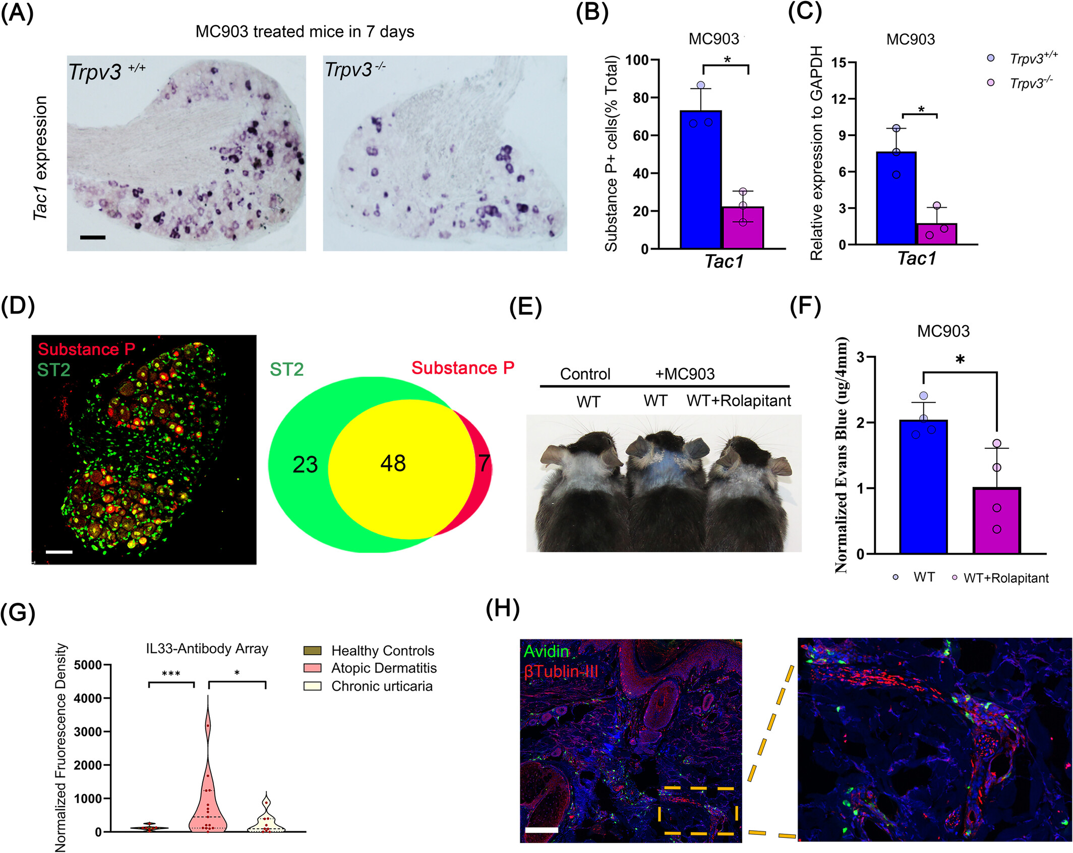 值得关注的是,该研究还揭示了TRPV3驱动的IL-33对感觉神经元的调控作用。研究发现,TRPV3基因敲除小鼠中,AD相关神经肽P物质(Substance P, SP)的表达显著降低;免疫染色显示,背根神经节中小直径神经元共表达SP和IL-33受体ST2,表明IL-33可直接作用于感觉神经元调控神经肽分泌。进一步功能实验证实,口服NK1受体拮抗剂(SP受体拮抗剂)可有效减轻皮肤水肿,提示SP-NK1R信号参与介导肥大细胞依赖的血管通透性调节,这也与此前荨麻疹研究中发现的肥大细胞、皮肤神经与血管内皮的密切交互机制相呼应,揭示了过敏性皮肤病共通的致病回路(图2)。