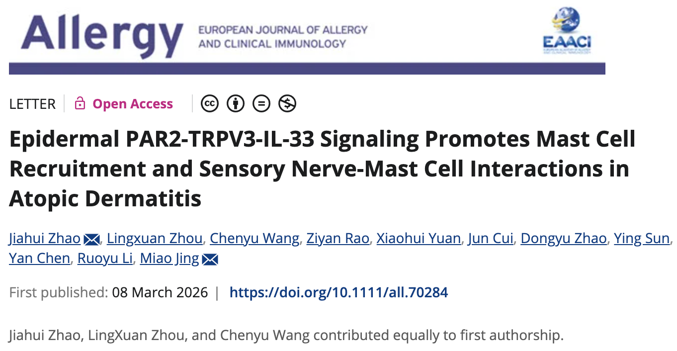 2026年3月8日,北京脑科学与类脑研究所井淼团队联合北京大学第一医院皮肤科赵嘉惠团队于Allergy(IF=12.0)在线发表题为“Epidermal PAR2-TRPV3-IL-33 Signaling Promotes Mast Cell Recruitment and Sensory Nerve-Mast Cell Interactions in Atopic Dermatitis”的论文,首次揭示了瞬时受体电位通道TRPV3偶联G蛋白受体PAR2调控皮肤神经免疫反应的具体机制。