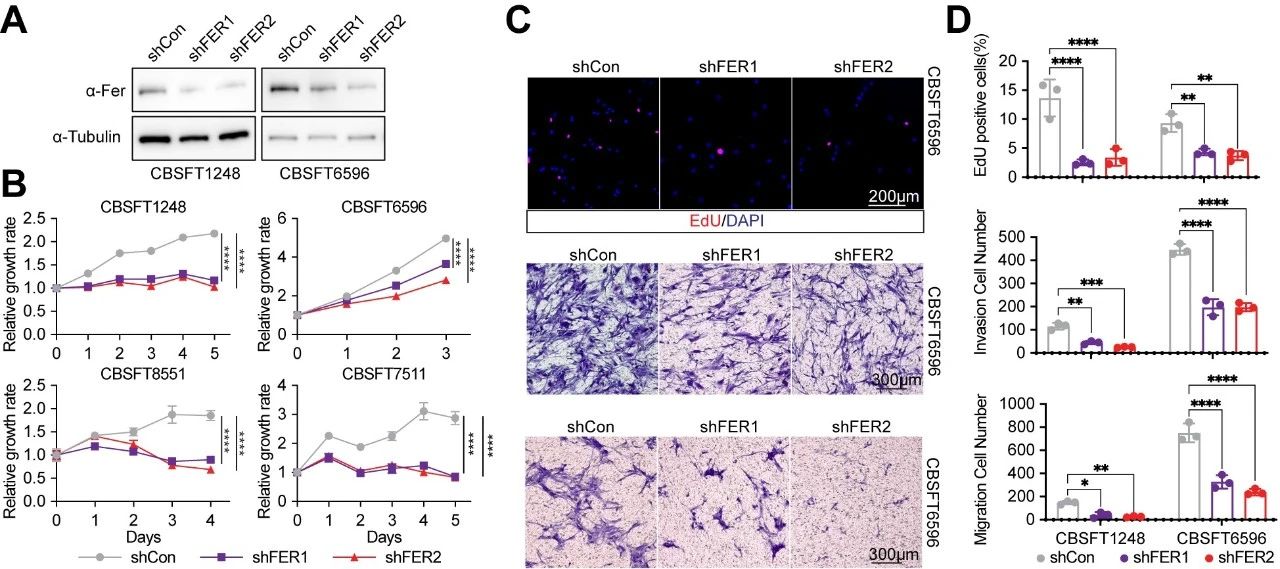 为寻找CNS SFT潜在的治疗药物和靶点,研究团队建立了目前国际上规模最大的CNS SFT原代细胞库,共计13株源自患者的新鲜肿瘤组织的原代细胞系。通过高通量小分子药物筛选体系,系统评估了超过4000种FDA批准及进入临床试验化合物的药效,结果发现:原代CNS SFT细胞对多种受体酪氨酸激酶(RTK)抑制剂表现出显著敏感性,其中包括临床常用的ALK抑制剂Ceritinib和EGFR家族抑制剂Pyrotinib。进一步的药物靶点解析中,研究人员鉴定出一个此前在SFT中未被系统研究的重要分子靶点——FER激酶。两种FER特异性抑制剂E260和DS21360717在多株原代细胞中展现出与Ceritinib、Pyrotinib相当甚至更优的抗增殖效果。功能实验证实,通过药物干预或shRNA沉默FER表达,均可显著抑制CNS SFT细胞的增殖、迁移与侵袭能力。机制研究进一步揭示,FER作为RTK下游多个关键信号通路的整合枢纽,是调控CNS SFT恶性进展的重要驱动因子。这一系列发现不仅为FER激酶的“可成药性”提供了坚实依据,也为临床治疗CNS SFT提供了全新的靶向策略与希望。