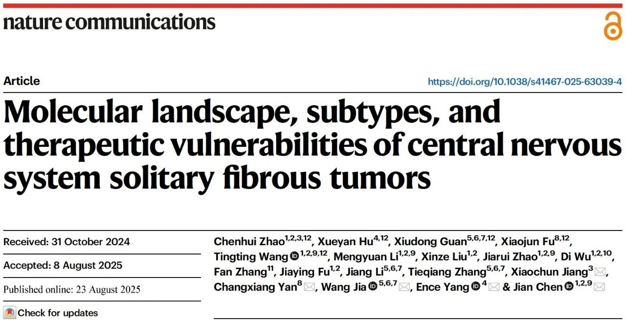 2025年8月23日,北京脑科学与类脑研究所陈坚团队、北京大学医学院杨恩策团队、首都医科大学天坛医院贾旺团队、三博脑科医院闫长祥团队以及皖南医学院第一附属医院江晓春团队的研究人员合作在Nature Communications上发表文章Molecular landscape, subtypes, and therapeutic vulnerabilities of central nervous system solitary fibrous tumors。本研究共收集189个SFT样本进行全面的基因组、转录组、单细胞及空间转录组的多组学分析,并建立了13株患者来源的CNS SFT细胞系,进行高通量药物筛选、靶标验证及通路机制研究,为CNS SFT个体化治疗和药物开发提供了重要依据。