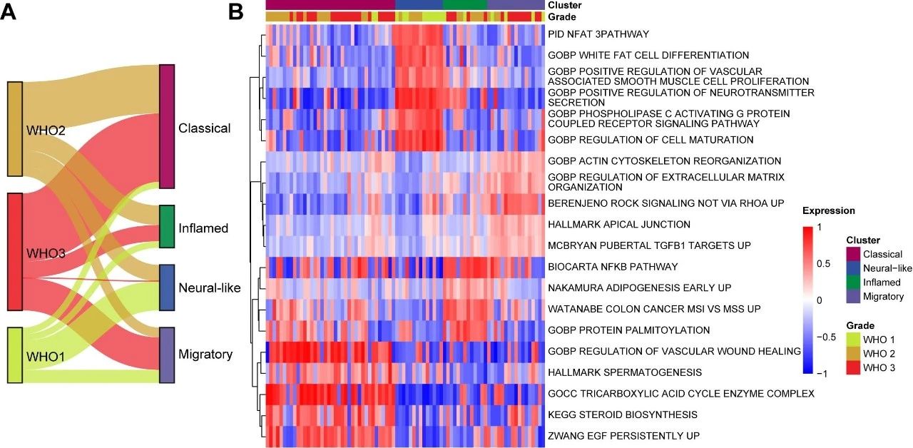 基于对转录组数据的系统性分析,研究团队首次将CNS SFT清晰地划分为四种分子亚型,分别为:“经典型”(Classical)、“神经样型”(Neural-like)、“炎症型”(Inflamed)和“迁移型”(Migratory)。这四类亚型在基因表达谱上展现出显著差异,且与肿瘤的病理级别、增殖活性、坏死程度及免疫微环境特征密切相关。例如,“经典型”表现传统SFT的典型特征,显示出更高的囊性坏死;“神经样型”富含细胞分化与神经递质分泌通路,常见于低级别肿瘤,预后较好;“炎症型”则表现出NF-κB通路高度激活及T细胞浸润,提示其对免疫治疗可能具有更高敏感性;“迁移型”富集细胞骨架重塑相关通路,可能与肿瘤侵袭性增强有关。