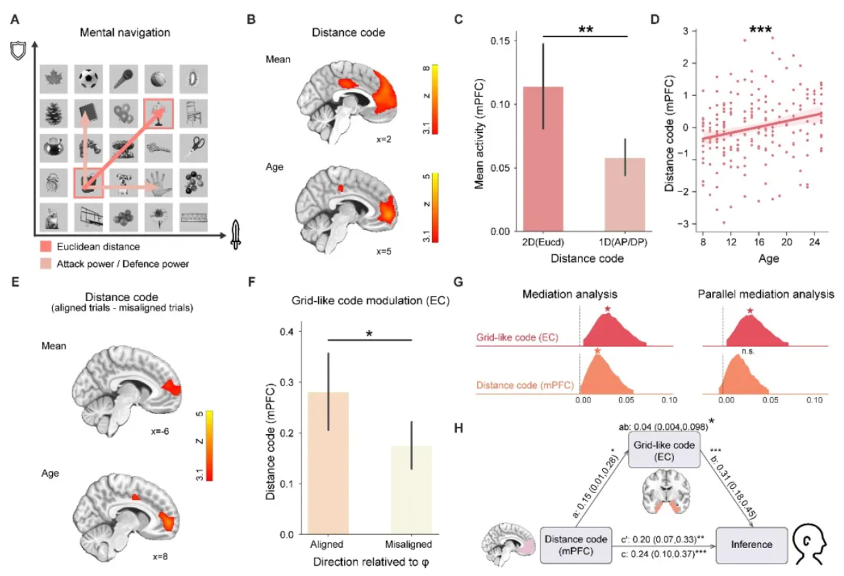 在确认EC中的"图式表征"之后,研究者进一步追问:这一抽象结构如何为具体推理过程所用?他们将目光转向内侧前额叶皮层(mPFC),发现mPFC在推理过程中编码的是二维知识地图上各对象间的概念空间距离,且这一"距离编码"随年龄增长而增强。