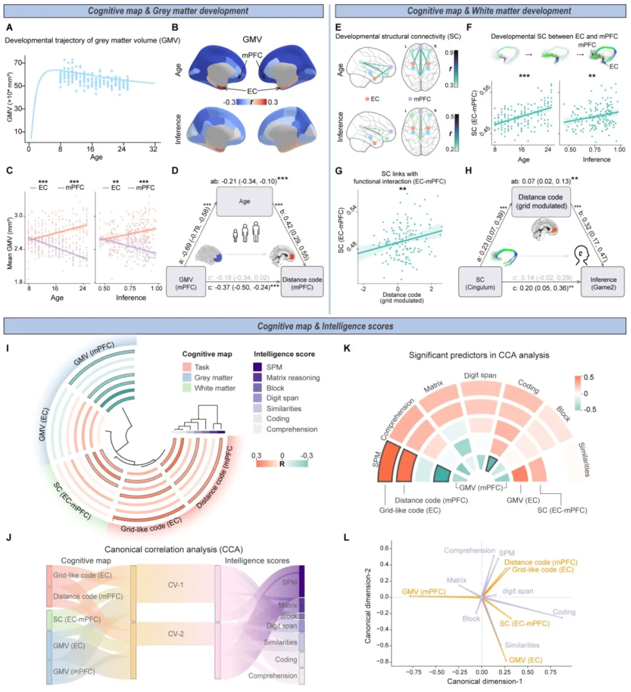 上述功能性发现获得了结构神经影像的支持。全脑皮层灰质体积在8至25岁间整体下降,符合已知发育轨迹;然而,EC的灰质体积却逆势增长,与年龄和推理能力均正相关,方向与大多数脑区相反。mPFC则经历灰质体积下降与功能表征增强的并行变化,提示其正经历一种结构-功能关系的发育性重组。