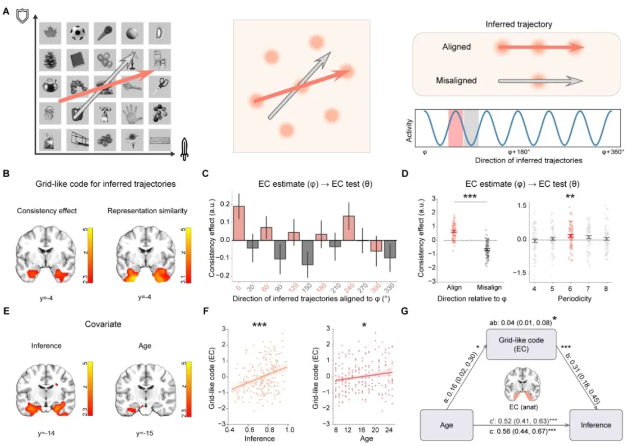 更关键的发现在于两者的关联机制:当推理轨迹方向与EC估计的网格朝向"对齐"时,mPFC的距离编码显著更强;"未对齐"时则减弱——提示mPFC的地图表征是在EC网格图式的"坐标框架"之上构建的。中介分析显示,对年龄-推理关系的驱动最终来自EC,而非mPFC。这表明,EC网格图式先于mPFC距离地图,是支持推理的核心机制。