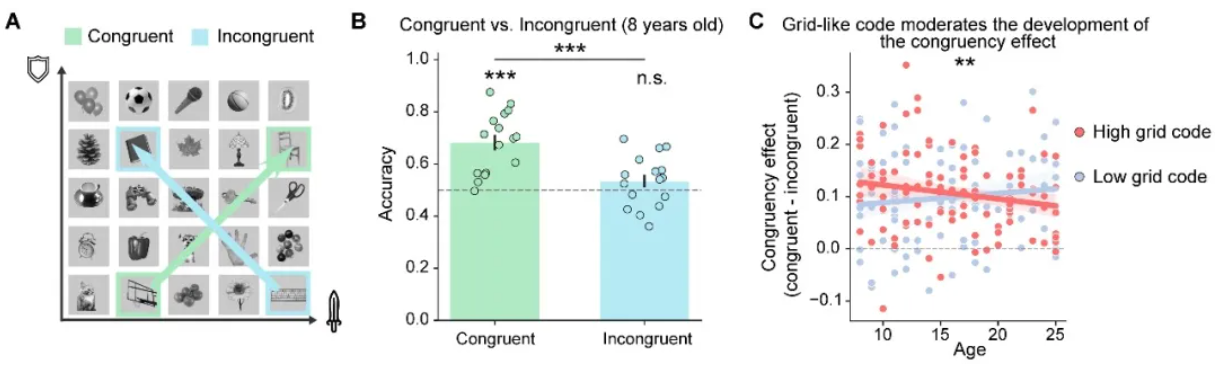 行为分析发现,8岁儿童在一致性试题上表现良好,但在冲突性试题上成绩崩塌至随机水平——两类题目之间的差距极为显著。进一步分析揭示,随年龄增长,冲突性试题相对于一致性试题的表现提升,仅在EC网格编码较强的参与者中出现;网格编码较弱的个体则看不到这种年龄相关的改善。