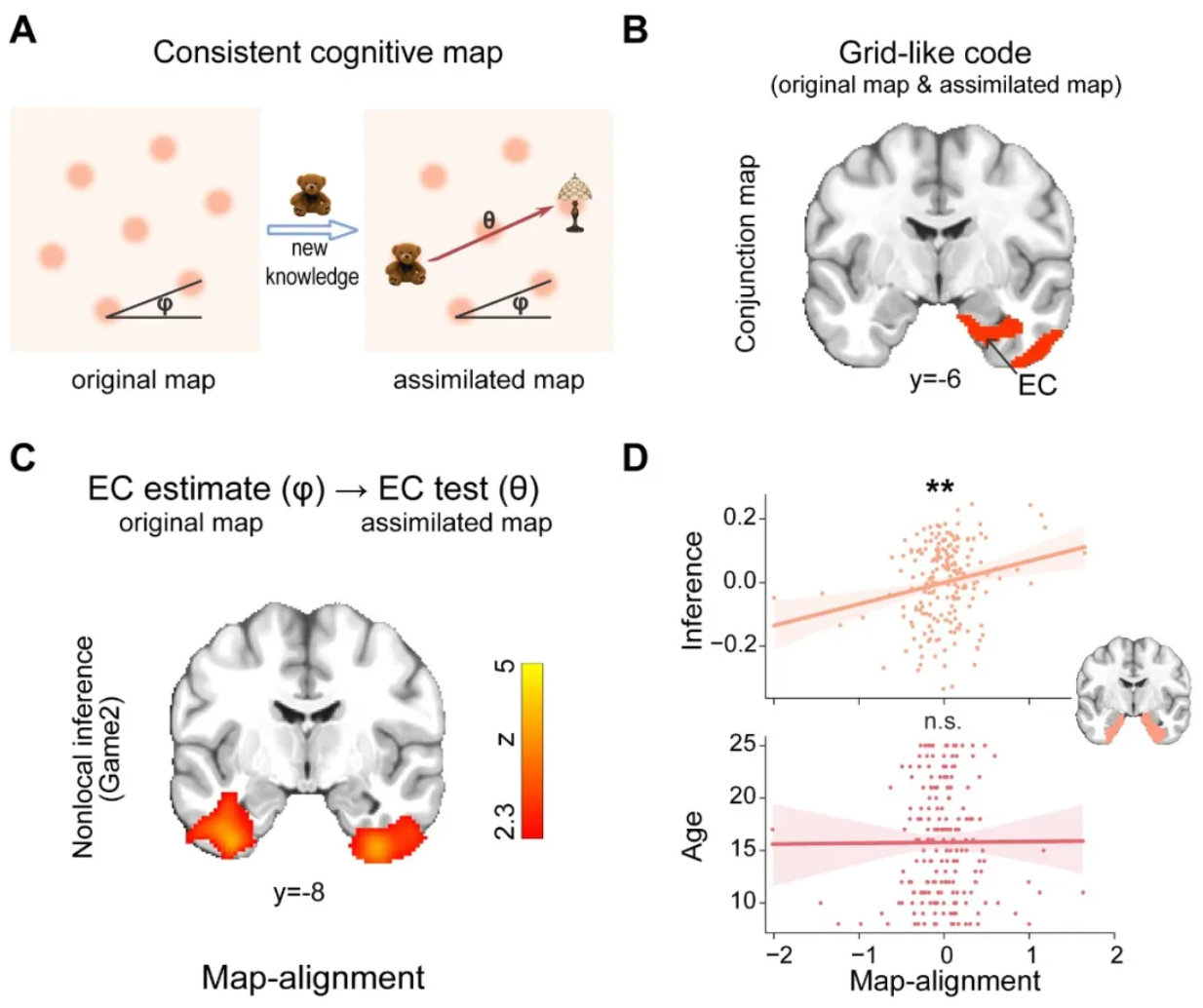 结果正如预期:新旧任务中的网格编码在EC存在显著重叠,直接证明了图式在知识更新后的稳定持续。EC网格朝向的对齐程度能够预测非局部推理表现,且这种预测力与年龄无关——说明它并非反映一般发育成熟度,而是专门衡量个体维持图式稳定、高效同化新知识的能力。
