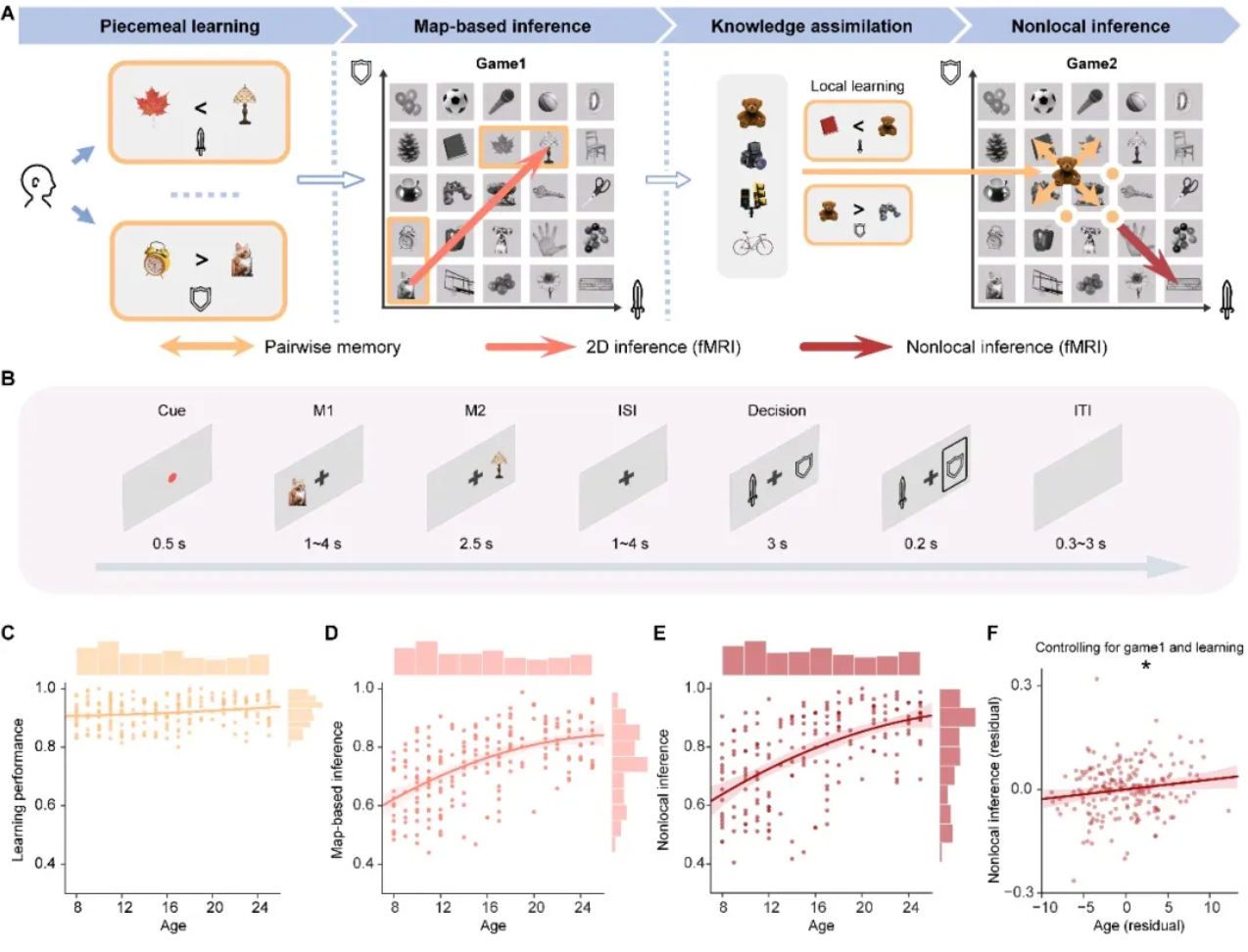 行为结果显示,年龄与推理正确率之间存在强烈正相关,即便控制记忆差异后依然如此——表明年龄对推理能力的影响独立于记忆优势之外。新知识同化能力同样随年龄显著提升,且独立于已有推理能力之外。这些结果表明,儿童期到成年期之间,确实存在一种不能被记忆力差异所解释的结构化推理能力的真实跃升。