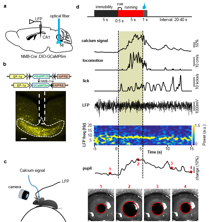 图一 未定核神经调节肽神经元活性与动物运动速度、觉醒水平,以及海马theta波正相关。由于动物的觉醒程度与瞳孔大小正相关,所以这项研究中以记录瞳孔大小变化来表征觉醒程度。另外由于空间记忆主要与海马theta波相关(海马theta波是在海马区记录到的6-10 Hz频率的脑电波),所以这项研究中以记录海马theta波作为一个记忆的指标。