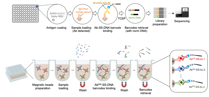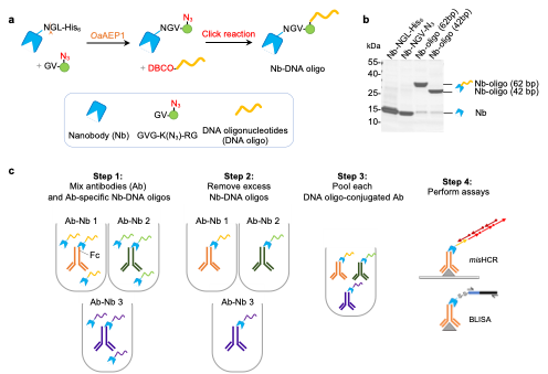 免疫化学分析(如免疫荧光染色、酶联免疫吸附技术ELISA等)是生物医学检测中最为常用的技术。该技术基于抗体和抗原间的特异性结合,通过检测抗体所偶联的信号分子,实现对样品中特定生物分子的定量和定位。由于信号分子(如荧光分子和化学发光底物)的种类有限,传统免疫化学分析方法难以在一个样品中同时检测多个目标分子。为了扩展检测的多重性并实现更高的检测通量,近年来研究人员将抗体与DNA分子连接,利用DNA序列的高度多样性和特异性,将不同的抗体用不同的DNA序列(即DNA条形码)区分开来以实现许多目标分子的同时检测,这种技术已经被广泛用于从诊断到治疗的众多应用中【1】。然而,当前的DNA条形码标记方法需要针对每一个抗体做定制化的制备流程,耗时且成本高,并且常用非位点特异性的偶联方式,降低了抗体的亲和力和特异性。