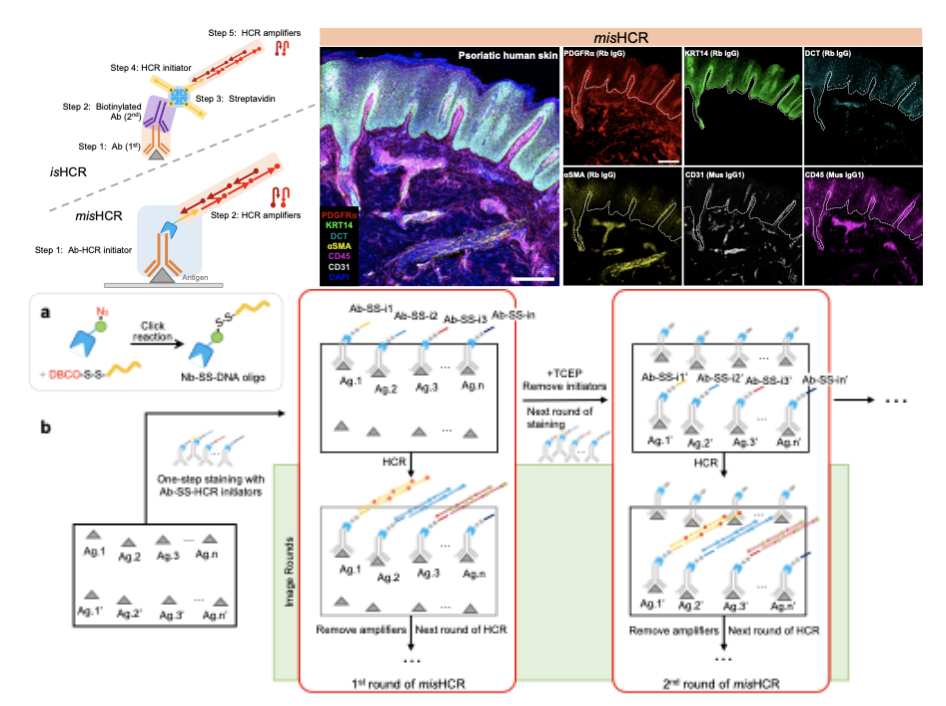 研究者将MaMBA策略与前期开发的isHCR免疫信号放大方法【5】结合,有效地将isHCR实验流程简化为一步染色(misHCR,图2)。在此基础之上,研究者在纳米抗体和DNA寡核苷酸之间引入了一个二硫键连接物(disulfide linker),发展了可切除版本的MaMBA策略(图2)。通过将可切除版本的MaMBA策略与misHCR方法相结合,进一步拓展了该方法的多重检测能力(misHCRn,图2)。研究者使用misHCR方法对银屑病患者的皮肤活检样品进行6种细胞类型生物标记物的多重免疫染色(图2),在这当中同时使用了4种兔源IgG一抗和2种小鼠源IgG1一抗,misHCR成功地展示了每种细胞类型的不同定位模式。研究者分别使用3轮和2轮misHCRn成功对小鼠中缝背核(Dorsal Raphe Nucleus)脑区切片样品进行9种和12种靶标蛋白的原位成像,且所用一抗均为兔源IgG。这些结果表明,基于MaMBA的misHCR方法可以实现特异性的、灵活的以及多重的原位生物分子成像。
