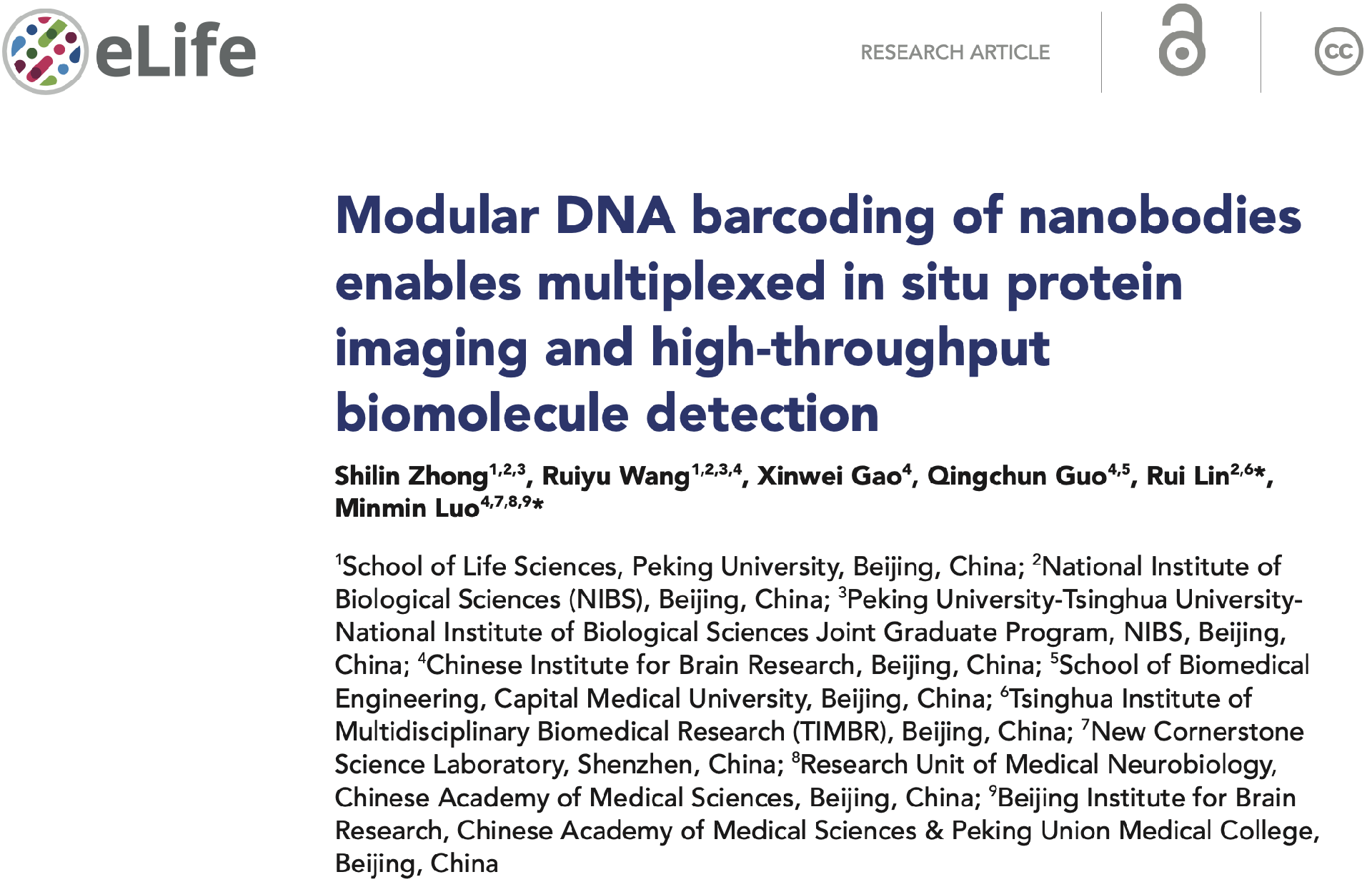 2025年7月22日,罗敏敏实验室与林睿实验室在eLife期刊在线发表了题为“Modular DNA barcoding of nanobodies enables multiplexed in situ protein imaging and high-throughput biomolecule detection”的研究论文。该研究提出了一种简单、经济且高效的模块化DNA条形码标记策略MaMBA(Multiplexed and Modular Barcoding of Antibodies)。