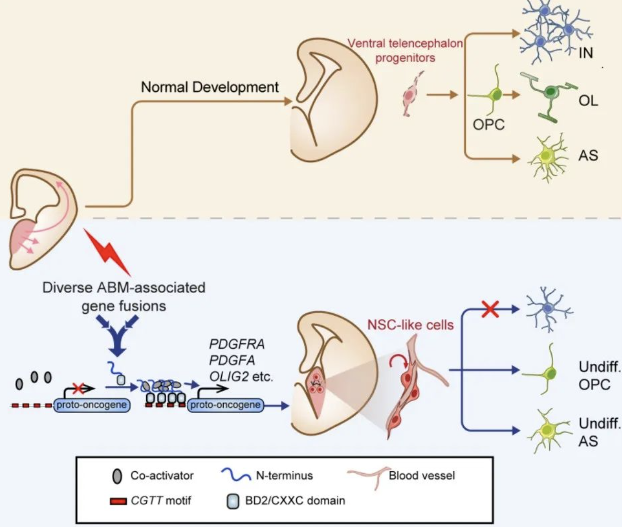 通过对患者样本的分析和转基因小鼠模型的构建,研究团队提出ABM肿瘤可能起源于腹侧端脑神经祖细胞 (ventral telencephalon neural progenitor)。端脑是胚胎发育中神经系统的前端结构,其不同区域的神经祖细胞具有独特的分子特征和发育轨迹。有趣的是,融合基因在不同类型的神经祖细胞中表现出截然不同的效应:其在腹侧端脑神经祖细胞中促进细胞异常增殖,而在背侧端脑神经祖细胞中诱导细胞死亡。进一步研究证明这种差异性效应与腹侧端脑神经祖细胞中特异性表达的Olig2基因密切相关。