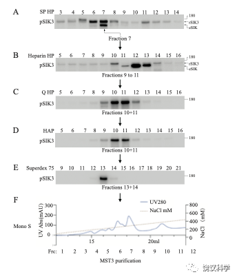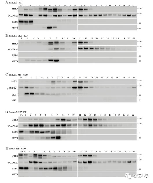 进一步的蛋白质质谱分析显示,其中有六个激酶。当这六个激酶被分别用基因表达后,只有MST3和MST4能够磷酸化SIK3-T221位点,而其他四个不能。