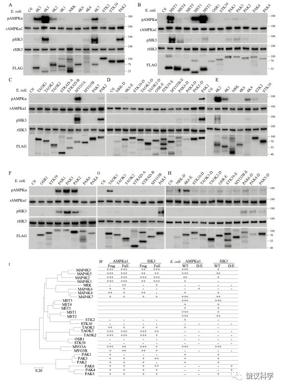 MST3和MAP4K5,无论是细菌表达的还是哺乳动物细胞表达的,都能够磷酸化现在通行已知的14个AMPK相关激酶。其中有些有磷酸化抗体,有些用蛋白质质谱鉴定磷酸化。