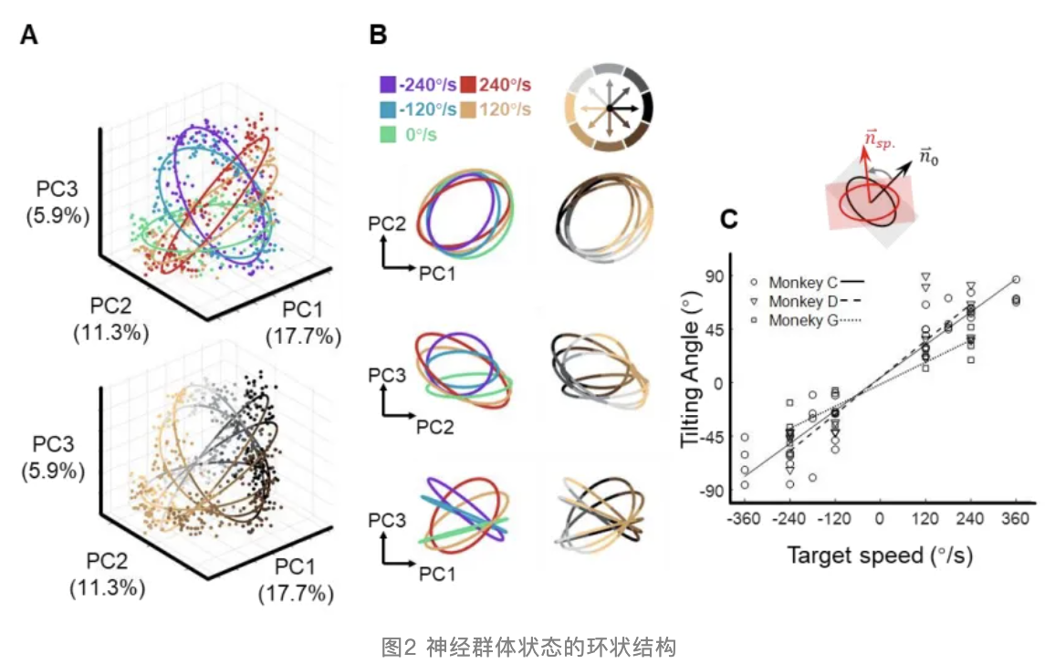 为了进一步研究本任务中的神经群体状态特征,研究者对运动起始(MO)前后50毫秒期间内神经群体活动进行主成分分析(PCA),降维得到了每个试次对应的神经状态,并展示在由前三个主成分张成的子空间中(图2A&B)。研究发现,同一目标速度条件下的神经状态形成了椭圆形的环状结构,且拦截条件(目标速度不为零)的椭圆所在平面与静止条件(目标速度为零)的椭圆所在平面之间的夹角,与目标速度呈线性正相关(图 2C)。同时,神经状态也按照运动方向聚集成簇,并按手动方向顺序分布。在神经活动低维子空间中出现的该环状结构,同时表征了感觉输入信息和运动输出信息,且感觉信息的调制的确发生在运动信息的正交方向上。