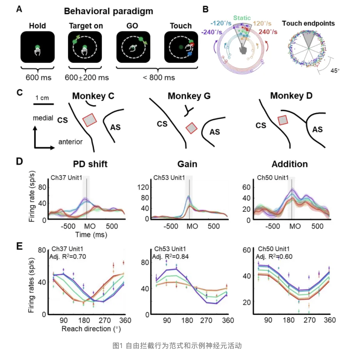 在本研究中,北京脑所崔翯团队的张艺衡等人训练猕猴完成手动拦截任务(manual interception task)(图 1A)。在猕猴执行任务的过程中,通常设置五种目标转动条件:顺逆时针、高低速度和静止目标(图 1B),研究人员通过多通道神经电生理技术(图 1C),记录运动皮层的神经电信号,发现运动皮层的神经元在编码运动方向基础上,确实受到感觉信息调制。调制作用可主要分为三类:偏好方向转移(PD shift)调制、增益(Gain)调制、基线加和(Addition)调制(图1D)。