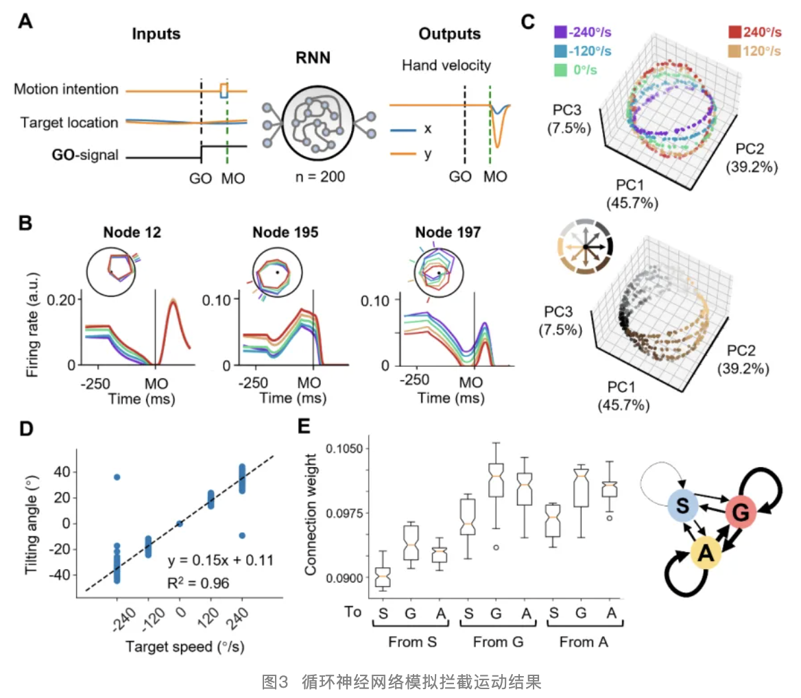 在此基础上,陈韵等人训练了100个单元构成的结构相同、初始权重不同的循环神经网络模型来模拟拦截任务中的神经活动(图3A)。在网络模型中,出现了类似的活动模式:类似感觉调制的节点和节点群体状态的低维环状结构(图 3B&C),并且,环状结构的夹角也保持与目标速度之间的线性关系(图 3D)。网络中显著的连接模式为后续研究运动皮层的功能连接提供了一些参考和方向。