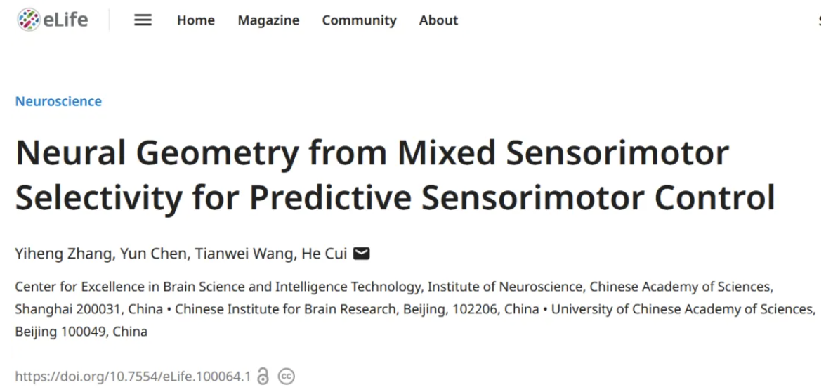 The He Cui Laboratory at the Chinese Institute for Brain Research (CIBR) published a research article title “Neural Geometry from Mixed Sensorimotor Selectivity for Predictive Sensorimotor Control” in eLife on August 7, 2024. The study reveals that the activity of most neurons is jointly tuned to both reach direction and target motion. Principle component analysis (PCA) on the neural population shows a clear orbital neural geometry in low-dimensional space at movement onset: The neural states were distributed in reach-direction order, and formed ringlike structures whose slopes were determined by target-motion conditions. The single-unit mixed selectivity and the ring structure also emerge in RNNs without specified instructions. The results of this study expand the functional understanding of the motor cortex, suggest that sensory modulation may be an important part of the process of predictive motor control, help exploring the neural mechanism of motor control of moving targets, and lay a foundation for the application of brain-computer interface in dynamic environments.
