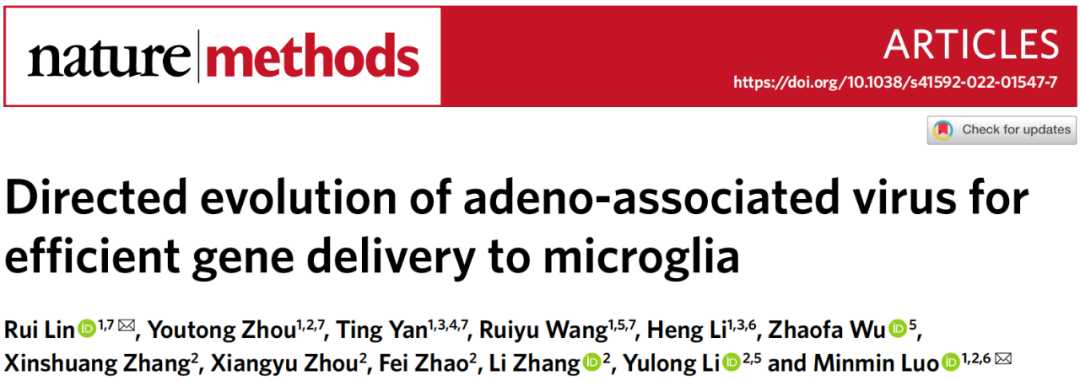 北京时间 2022年7月25日晚23时,北京生命科学研究所/北京脑科学与类脑研究中心罗敏敏实验室在国际权威学术期刊Nature Methods在线发表题为“Directed evolution of adeno-associated virus for efficient gene delivery to microglia”的研究论文。