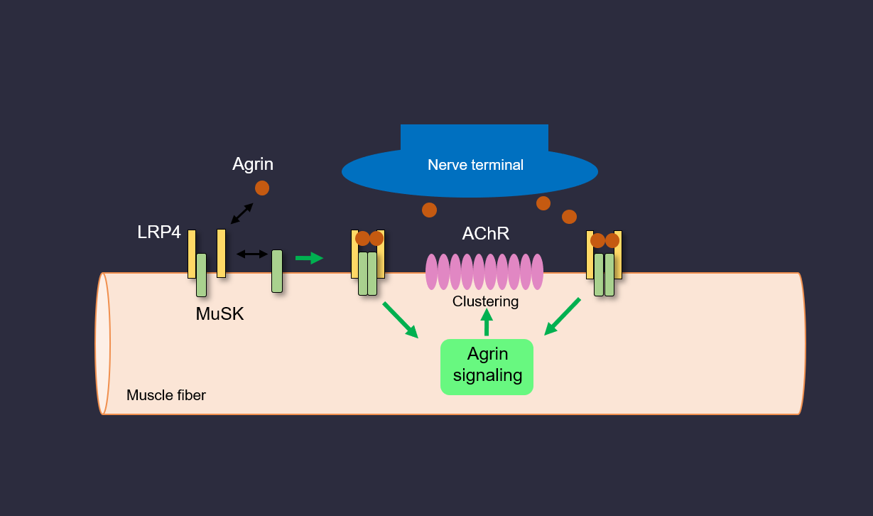 人们的日常活动中,如起床、走路、吃饭、饮水和坐立,都需要NMJ发挥正常功能。NMJ是运动神经元和肌肉纤维之间的外周突触,对于精确且快速的控制肌肉收缩至关重要。这种长久以来被神经科学家认可的经典化学突触早已成为突触结构和功能的信息模型。尽管众多NMJ突触成分已被鉴定出,但它们到底如何组装并最终形成了NMJ尚不清楚。目前,人们已知NMJ的形成需要agrin(一种来自运动神经元的营养因子)和MuSK(一种可被agrin激活的跨膜酪氨酸激酶)。然而,Agrin 不与 MuSK 直接互做。在此基础上,我们实验室率先确定了LRP4为agrin的受体(直接互作),并通过解决agrin-LRP4复合物的晶体结构揭示了信号如何从agrin转移到MuSK的机制。在针对重症肌无力患者开展的研究中,我们鉴定了针对LRP4和agrin的抗体,并证明它们与重症肌无力有关。这些抗体被用作诊断重症肌无力的新型生物标志物。与此同时,我们还揭示了rapsyn,一种经典的突触后支架蛋白,可通过液-液相分离的方式形成无膜缩合物,帮助AChR聚集及NMJ形成。此外,我们的研究还进一步证实了rapsyn具有NMJ形成所需的E3连接酶活性,其酶活对NMJ的发生、维持和再生至关重要。