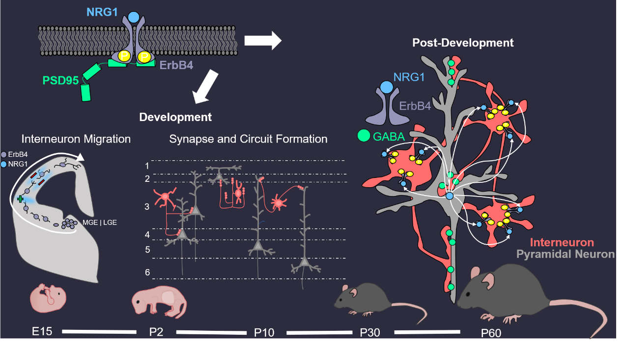神经元主要有两种类型:使用谷氨酸作为神经递质的兴奋性(也称为投射或锥体)神经元以及释放GABA的抑制性中间神经元(IN),占大脑中总神经元比例的大约15%-20%。目前人们已知中间神经元可通过前馈和反馈抑制控制投射神经元的发放。中间神经元增加了皮层网络的计算能力,并同步了对振荡活动至关重要的局部和远端皮层环路。研究表明,GABA信号传导的中断与脑部疾病有关,包括自闭症、抑郁症、智力残疾、Rett综合征和精神分裂症等。我们实验室的研究已经证明了NRG1及其受体ErbB4对大脑中的GABA活性至关重要。我们发现,NRG1由锥体神经元以活动依赖性方式产生。它与中间神经元中的ErbB4结合以促进GABA释放,从而抑制锥体神经元的活动。这种稳态通路对诸多大脑功能尤为关键,包括工作记忆和恐惧。此外,NRG1和ErbB4都是重度抑郁症和精神分裂症的风险基因。我们的研究为众多严重的脑部疾病的病理生理机制提供了见解。