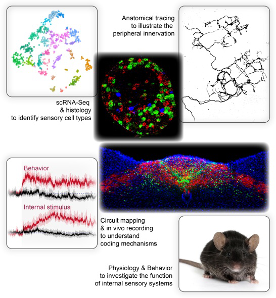 我们实验室试图了解生物体感知内部状态的感觉机制及功能。我们从初级感觉细胞入手,目前已建立了其分子图谱,以及控制不同感觉细胞亚型的特异性遗传操纵工具。在此基础上,我们将应用多学科交叉的研究手段(例如分子遗传,结构及环路示踪,在体成像,生理活动及行为分析,计算建模)来解析感觉神经系统如何检测身体内部状态信息以调控生物体的生理,行为,及情绪活动。